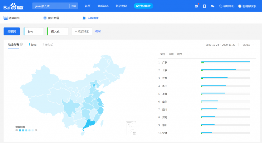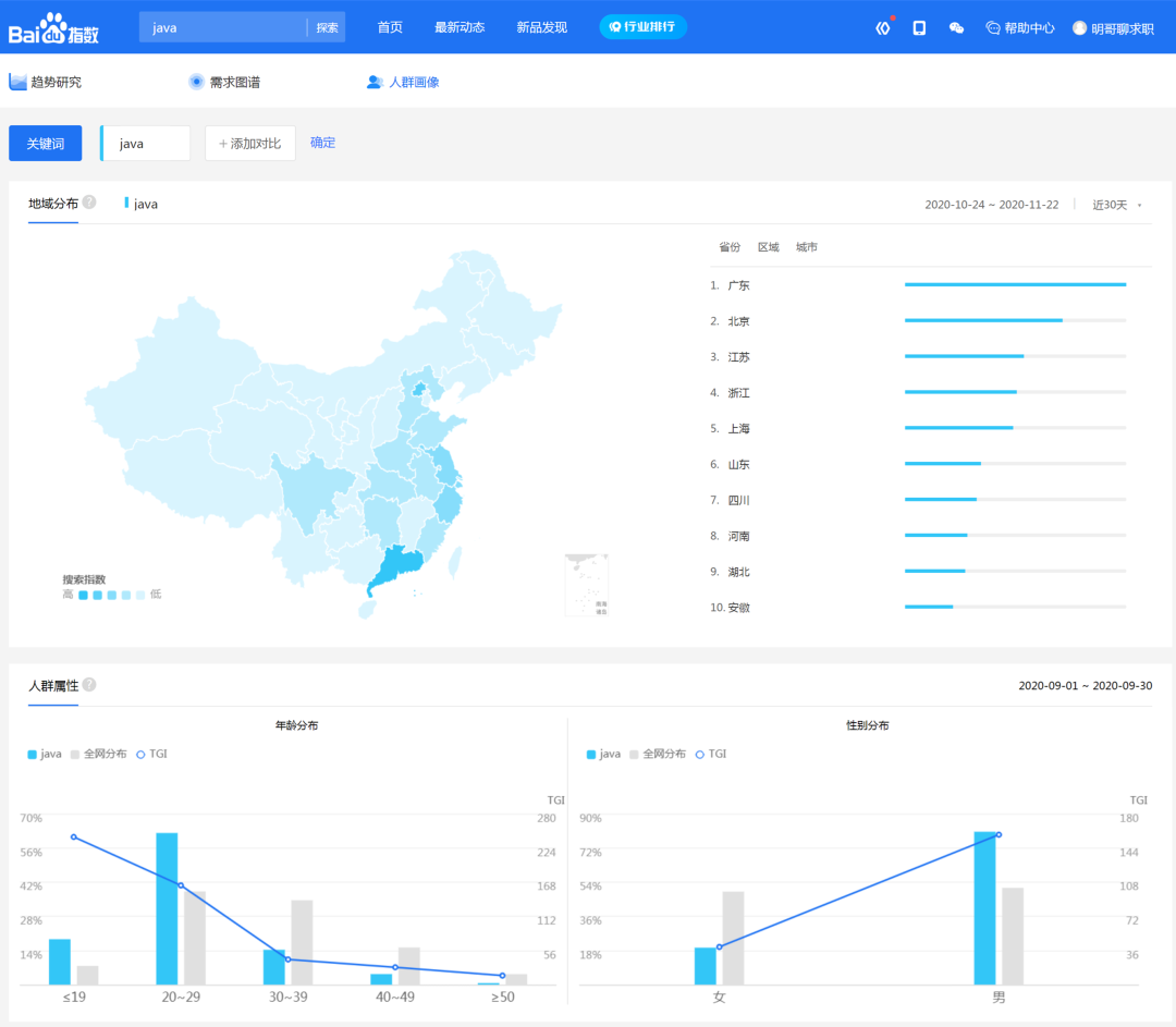 可以通过求职招聘网站,判断意向城市的职位需求数量,还可以使用工具如百度指数(index.baidu.com)获取更多信息,如Java程序员,搜下关键词“Java”,然后选择“人群画像”,全国各地域的从业人员分布图,包括年龄分布、性别比例等一目了然。