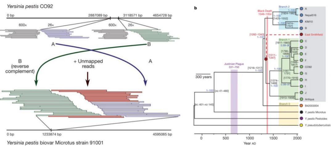 前面提到的加拿大科学家博纳尔和德国图宾根大学(University of Tübingen)的克罗斯(Johannes Krause)率先将这两种技术结合起来应用于古代微生物 DNA 的研究。这一次,在英国东史密斯菲尔德(East Smithfield)的黑死病古墓,这个吉尔伯特和库珀等人“失败”的地方,加-德团队成功在99副骨骼+牙齿中的20个提得鼠疫杆菌的 DNA[22]。具体地说,研究人员拼接了这些古代细菌的质粒基因组,并序列分析确定了它们是来自鼠疫杆菌的“遗骸”。他们的实验看上去满足了吉尔伯特要求的一切苛刻条件:在从未接触过鼠疫杆菌的环境里进行,有独立实验室重复,并找到了古代鼠疫杆菌的独特序列。作者还搜索了第二次大瘟疫前的古墓,并未找出鼠疫杆菌的踪影。加-德团队又再接再厉,于2011年发布了首个完整的古代鼠疫杆菌基因组[23]。