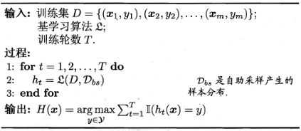 (2)进行同样的操作进行T次得到T个每个含m个样本的采样集,基于每个采样集训练一个基学习器。