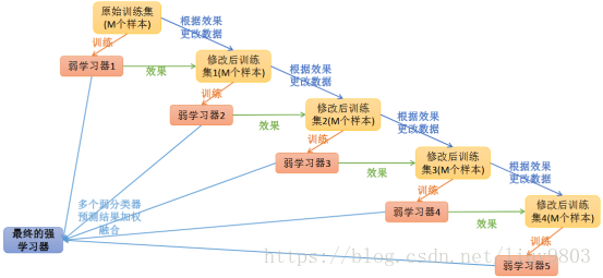 (2)其工作机制为:先从初始训练集训练出一个基学习器,再根据基学习器的表现对样本分布进行调整,使得先前的基学习器做错的训练样本在后续收到更多的关注,然后基于调整后的样本分布来训练下一个基学习器;如此重复进行,直至基学习器数目达到实现指定的值T,或整个集成结果达到退出条件,然后将这些学习器进行加权结合。正确率越高的基学习器的获得的权重越大。Boosting可以用于分类和回归问题。