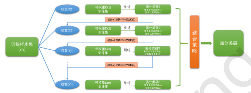 - 重采样法(re-sampling):对于无法接受带权样本的基学习算法,在每一轮学习中,根据样本分布对训练集重新进行采样,再用重采样得到的样本集对基学习器进行训练。
