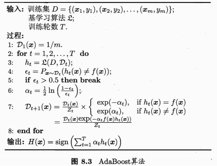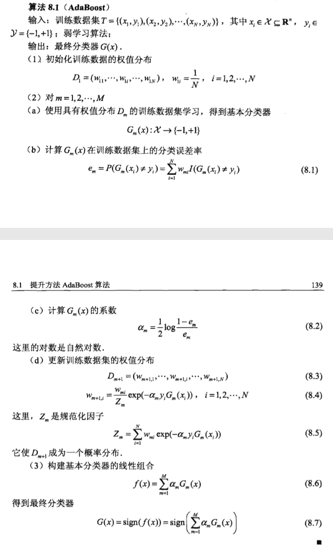 AdaBoost算法是模型为加法模型、损失函数为指数函数、学习算法为前向分步算法的二分类算法。AdaBoost算法中最重要的应该就是样本权重更新公式的推导。