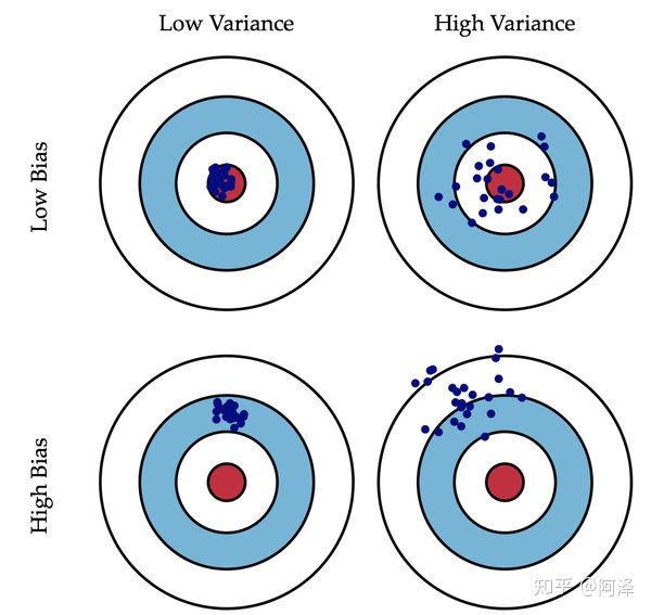 偏差(Bias)描述的是预测值和真实值之差;方差(Variance)描述的是预测值作为随机变量的离散程度。放一场很经典的图: