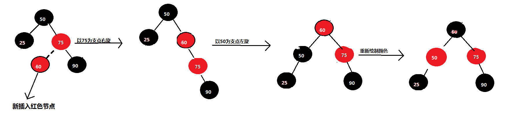处理:以父节点为支点进行右旋,然后以祖父为支点进行左旋,最后给父节点(第一次旋转后的父节点)绘制为黑色,给祖父节(第一次旋转后的祖父节点)点绘制为红色