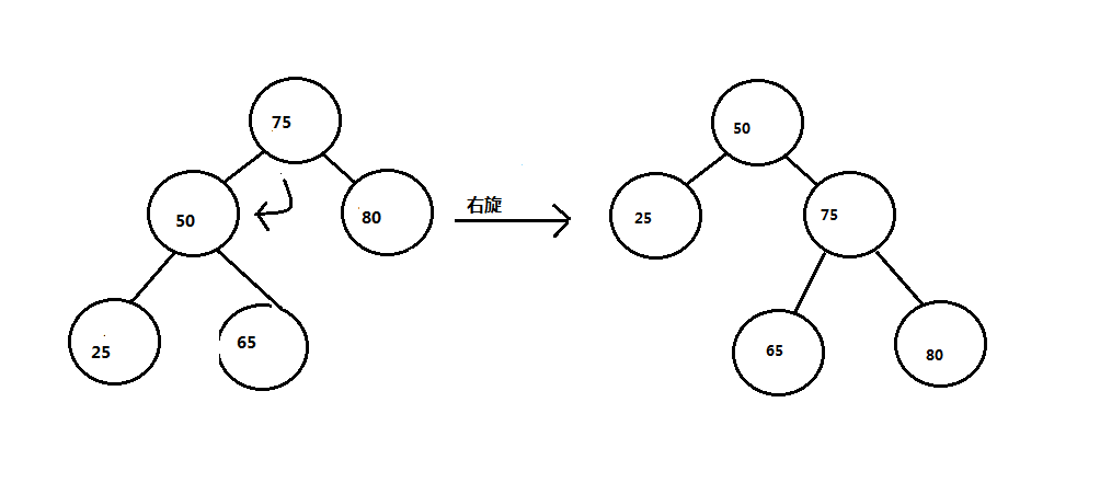 此处,以75为支点顺时针旋转,然后50成为了顶点,75成为了50的右子节点,65成为了75的左子节点,这就是右旋转操作。