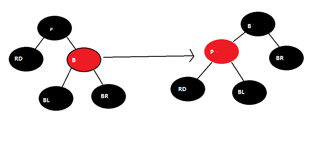 处理:如果B节点为红色,那么P节点和B的两个子节点都是黑色。交换B节点和P节点的颜色,然后以P节点为支点进行左旋转。这样处理后,就将情况(b)转为(c),(d),(e)中的一种。