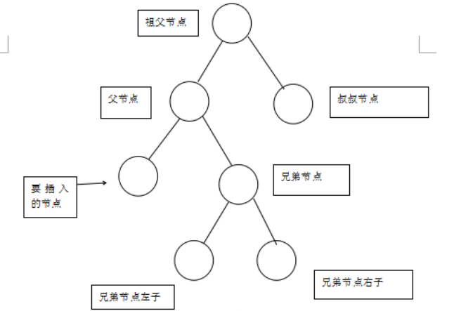 在满足父节点是红色,叔叔节点是黑色的条件下,我们可以分以下几种情况: