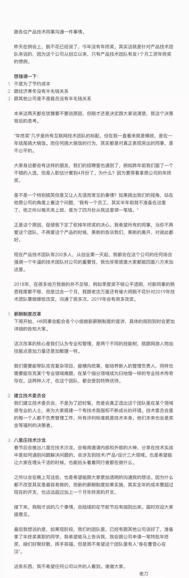以下是罗胖旗下公司CTO老刀写给产品技术员工的内部信,虽然文采不咋滴,病句也不少,但是理直气壮得很,牛逼之气跃然纸上,无辜之态昭然若揭。诸君请看——