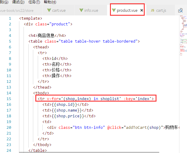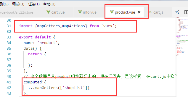 到这步,vuex的模板基本,但是没有效果怎么办,现在开始修改的product.vue中data中的shoplist剪切到cart.js中的state中,