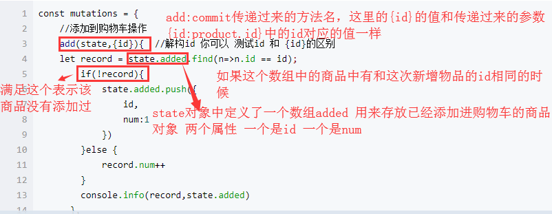 - 既然我们分发出来了一个add的方法,我们在mutations中接受,mutation中可以直接拿到state里面所有的数据,因为这里的added是自己定一个已选商品的数组,我组件中点击时传递一个对象过来的,find这个对象,但是这里有2种情况,一个added为空或者有数据,但是不是当前点击的对象的数据,当为空时,我们人为个这个对象push一个id和num为1的值,有点击就是当前这个对象的时候,我们执行++的操作,这里打印一下的值,或者从vue-tool的种查看的,vuex的一个浏览器的查看,自己百度去安装,查看数据比较方便