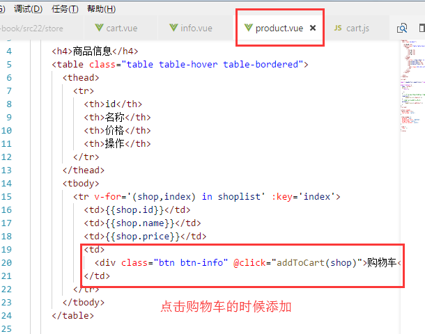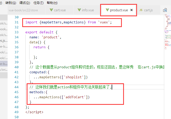 - 这里vuex中action的addToCart方法写好了,如何product.vue中的addToCart方法对应上去呢?