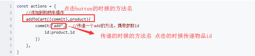 - 现在编写addToCart的方法,我们会到cart,js 中的action里面去,查看文档action的介绍,需要commit来分发actions