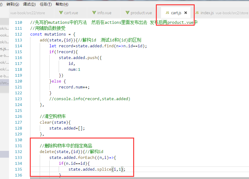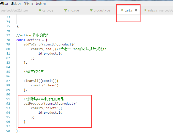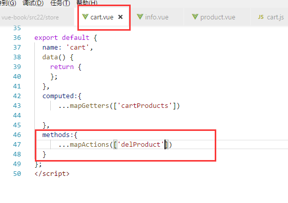 - 将actions中delProduct和car.vue中的组件联系到一起,前面已经介绍过了。cart.js中的actions