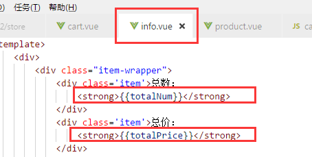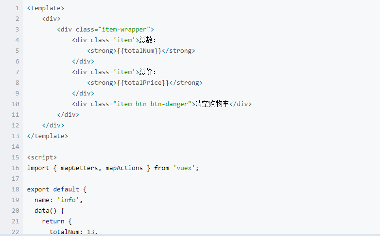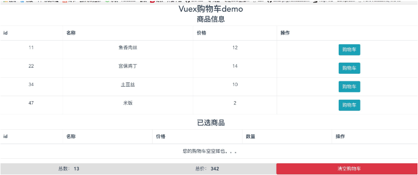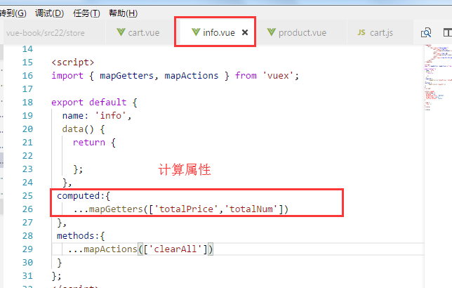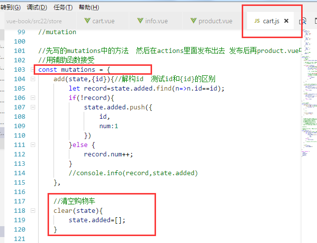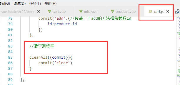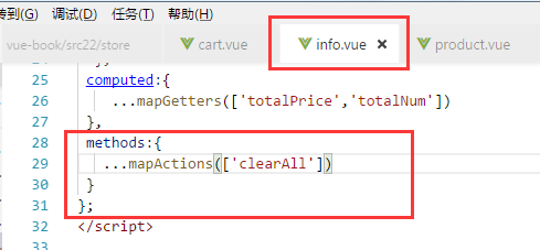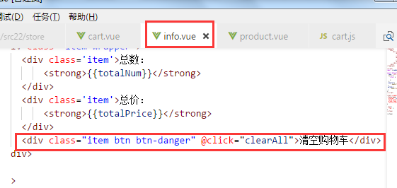 - 将actions中clearAllCart和info.vue中的组件联系到一起,前面已经介绍过了。cart.js中的actions
