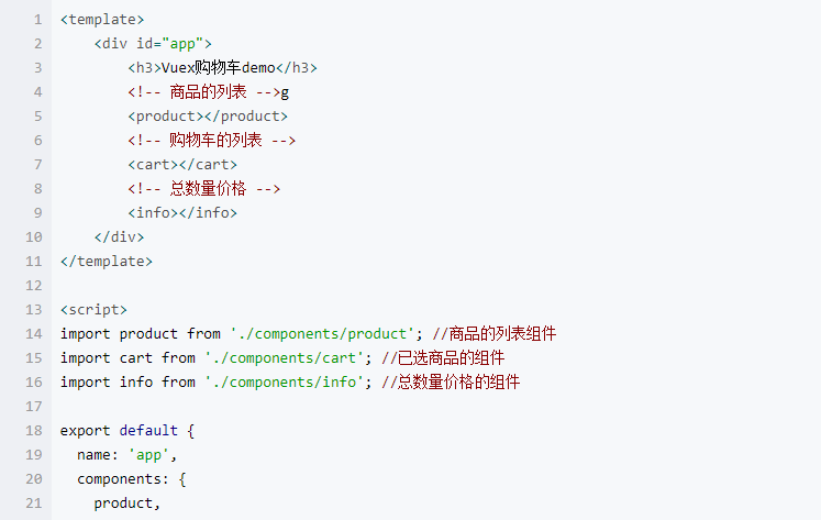 解释这里为什么要分开组件的编写,vuex是就是存储的数据的中心的,每个组件都是拿到数据,这样才能vuex的价值