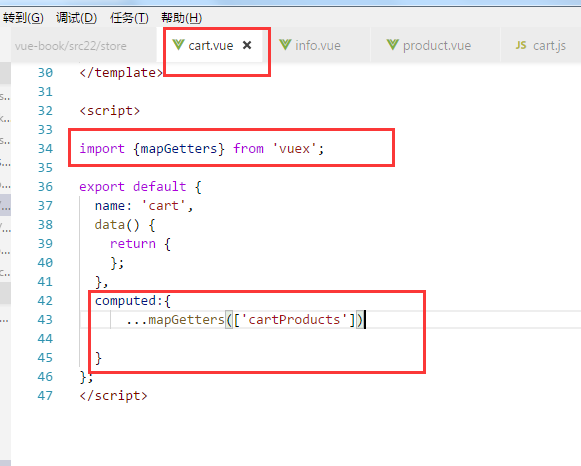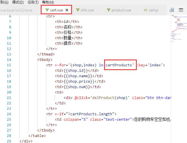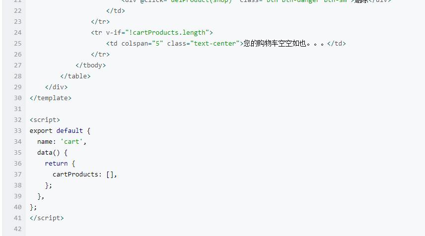 这里我们需要将cartProducts这个抛出去,和shoplist的方法一样的,只不过这个是在cart.vue中操作,