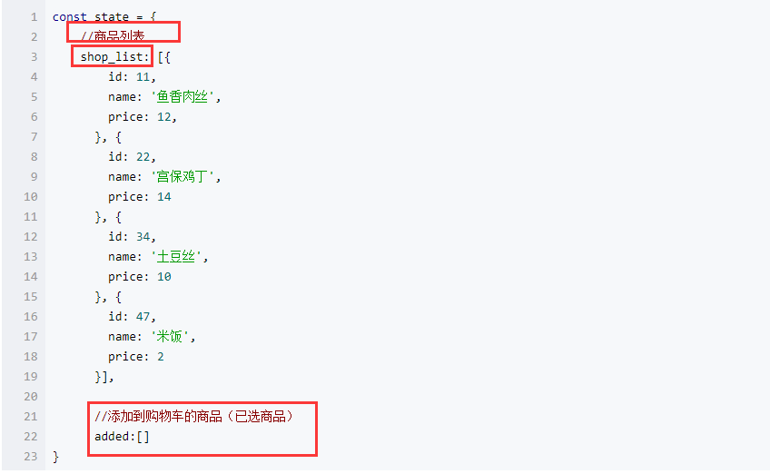 这里解释一下,state和组件中大data作用是一样,都是的设置假数据的和变量,查看文档的state修改cart.js的state