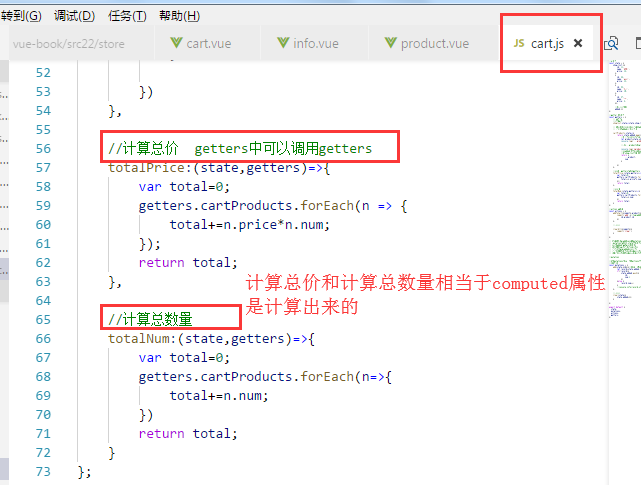 - 现在我们开始计算总价,总数量 和 清空购物车功能,在getter中操作,