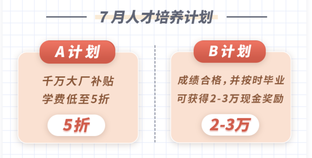 不得不提一下,现在你们还能赶上拉勾教育的「7月人才培养计划」,什么意思呢?就是你花钱报名了,如果你成绩合格,并按时毕业,就能拿到 2-3 万现金奖励。是的学完直接发钱,简直是白嫖。