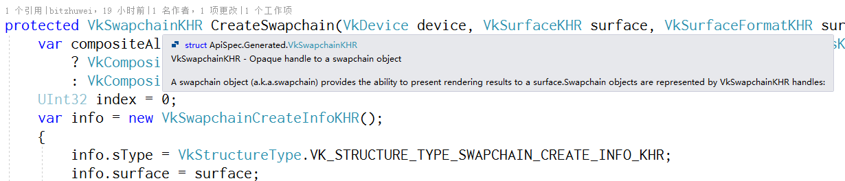 我在网上找到的几个Vulkan库,基本上都没有什么注释,这让我使用起来很不方便,严重妨碍了学习速度。很多结构体的成员类型都是粗糙的 IntPtr ,而不是具体类型的指针,这也使得用起来很麻烦。