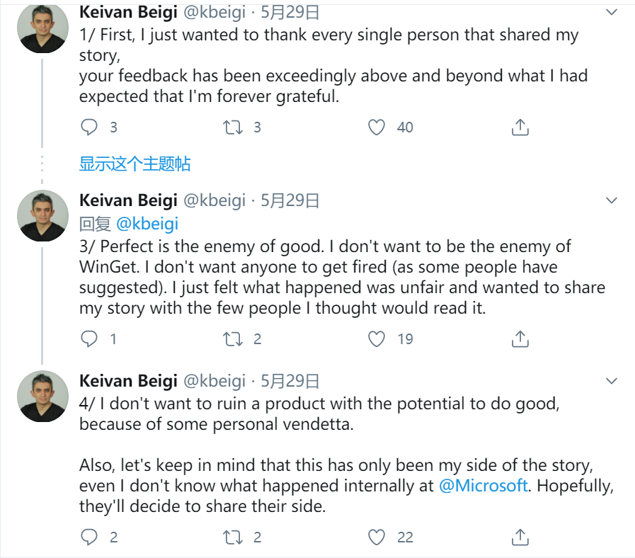 5 月 30 日,微软产品经理 Andrew 在微软官方发文回应称,“去年夏天,我们与 Keivan 进行了交谈,探讨了共同提供 Windows Package Manager 的潜在机会。AppGet 具有许多品质,确实可以帮助我们为 WinGet 找到更好的产品方向。” 承认了 Keivan 与 AppGet 对微软 WinGet 项目的贡献。