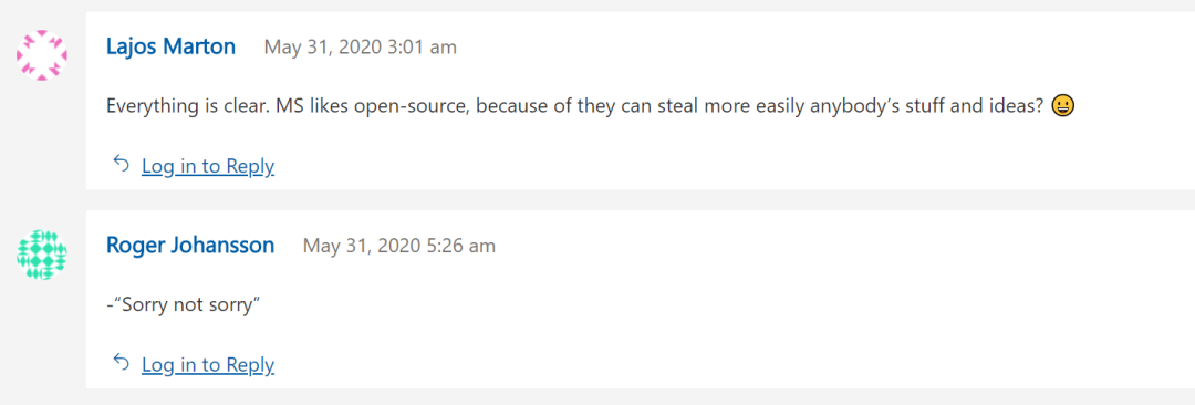 jamiebuilds 提到,如果是其他人做了这件事,他或许会有点不高兴但仍然把他忽略掉。但微软这样一个万亿市值的软件业巨头做这样的事情,这令他非常生气。