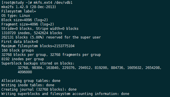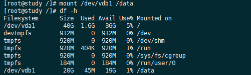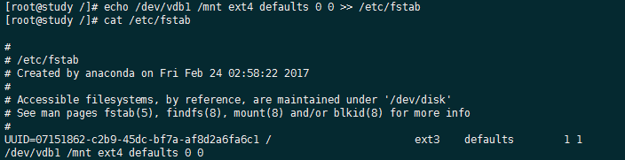 >echo /dev/vdb1 /mnt ext4 defaults 0 0 >> /etc/fstab
