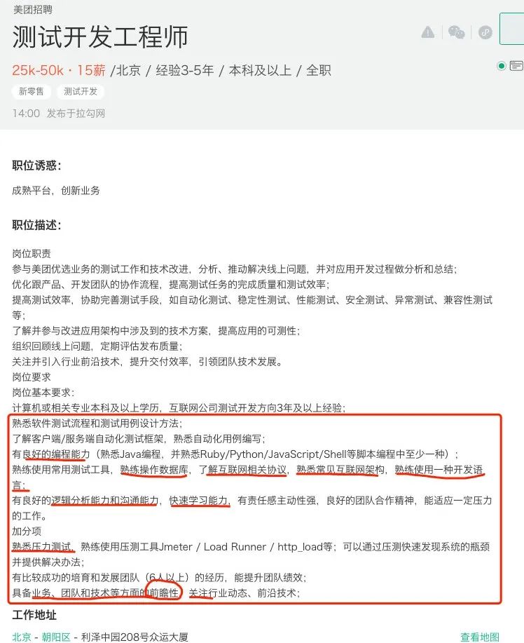 可能你觉得我说得夸张了,不过可以看看拉勾网上美团的测开 JD,我说的一点没差吧~对比一下你就知道自己为啥薪资总在 10k 左右晃悠了。