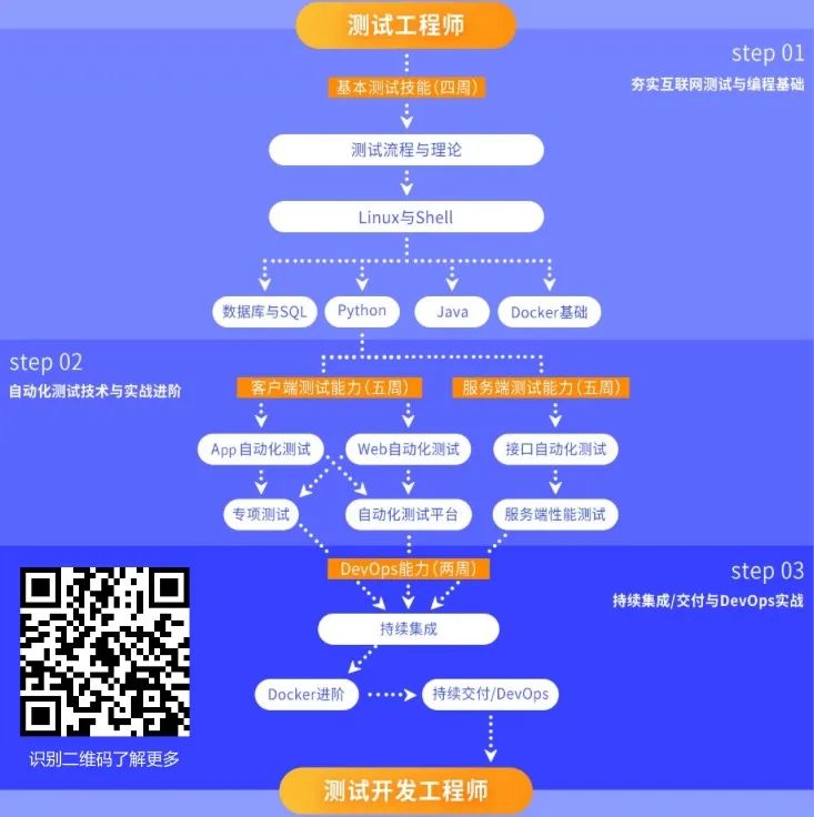 拉勾教育(拉勾招聘旗下教育品牌)与国内外 60+ 企业资深测试负责人进行了深度调研,得出了测试人的学习路线图,并根据 BAT 最新测试体系设计出《测试开发工程师·名企直推营》,以帮助测试人从「传统测试」转型至「测试开发」。