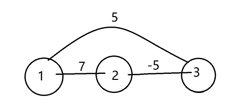 像上图,如果用dijkstra算法的话就会出错,因为如果从1开始,第一步dist[2] = 7, dist[3] = 5;在其中找出最小的边是dist[3] = 5;然后更新dist[2] = 0,最终得到dist[2] = 0,dist[3] = 5,而实际上dist[3] = 2;所以如果图中含有负权值,dijkstra失效