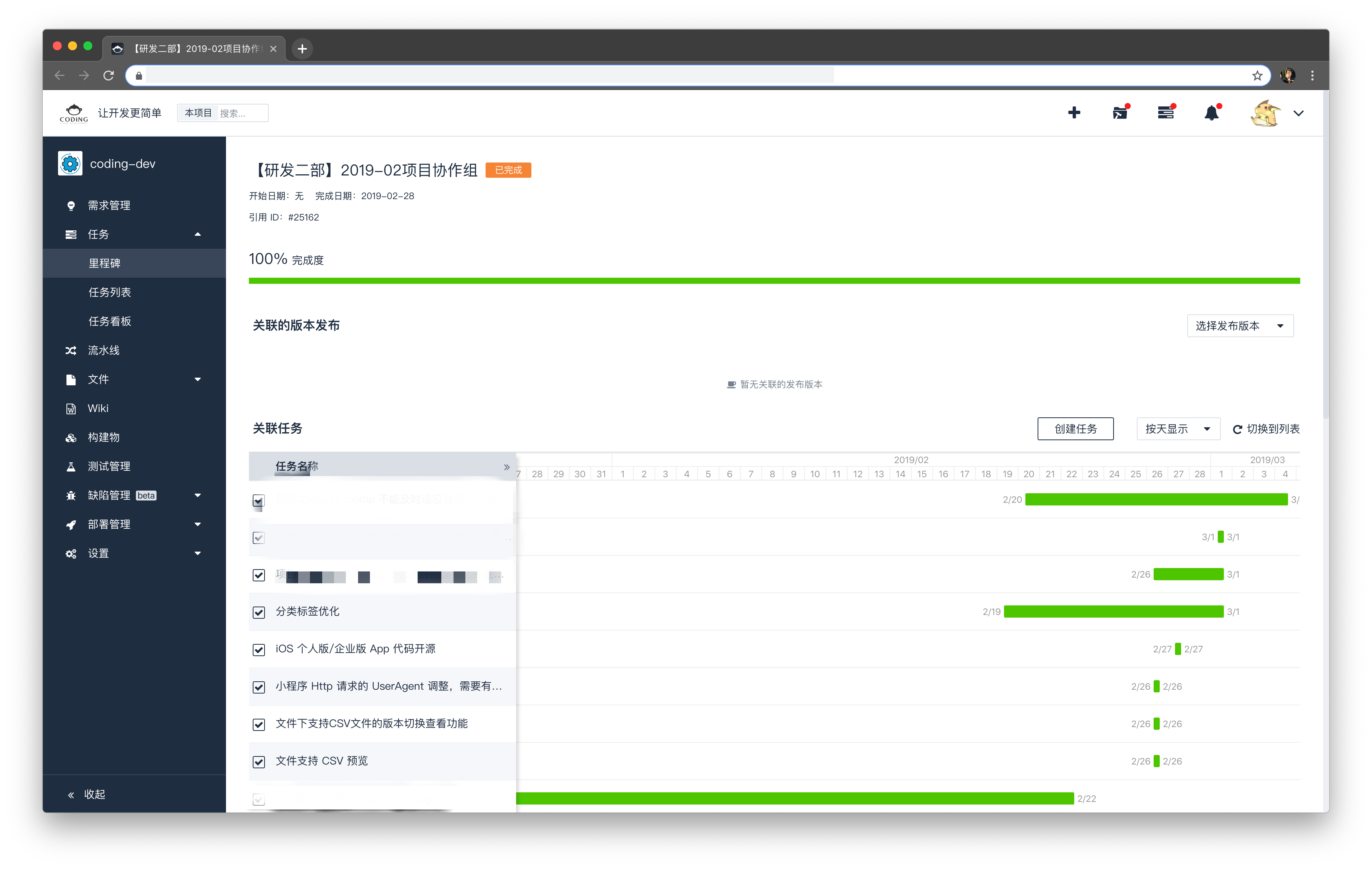 CODING 研发部门的工作流都是在项目内进行:我们使用任务功能来管理需求,使用文件来保存产品原型,使用代码功能进行开发,使用持续集成来进行自动化测试,使用缺陷管理来收集反馈,同时还使用 wiki 模块对知识进行储存与共享。通过在任务中添加关注者的方式来方便相关同事随时 follow 和 review 任务动态。