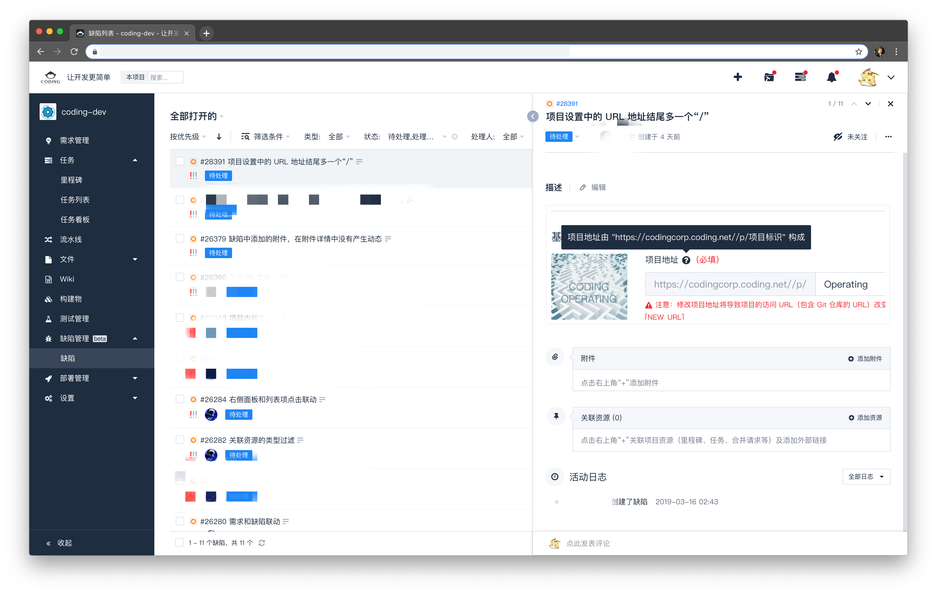 CODING 的产品经理在正常的产品功能排期之外,会定期在缺陷管理中查看用户的使用反馈并对相关问题的修复进行排期。