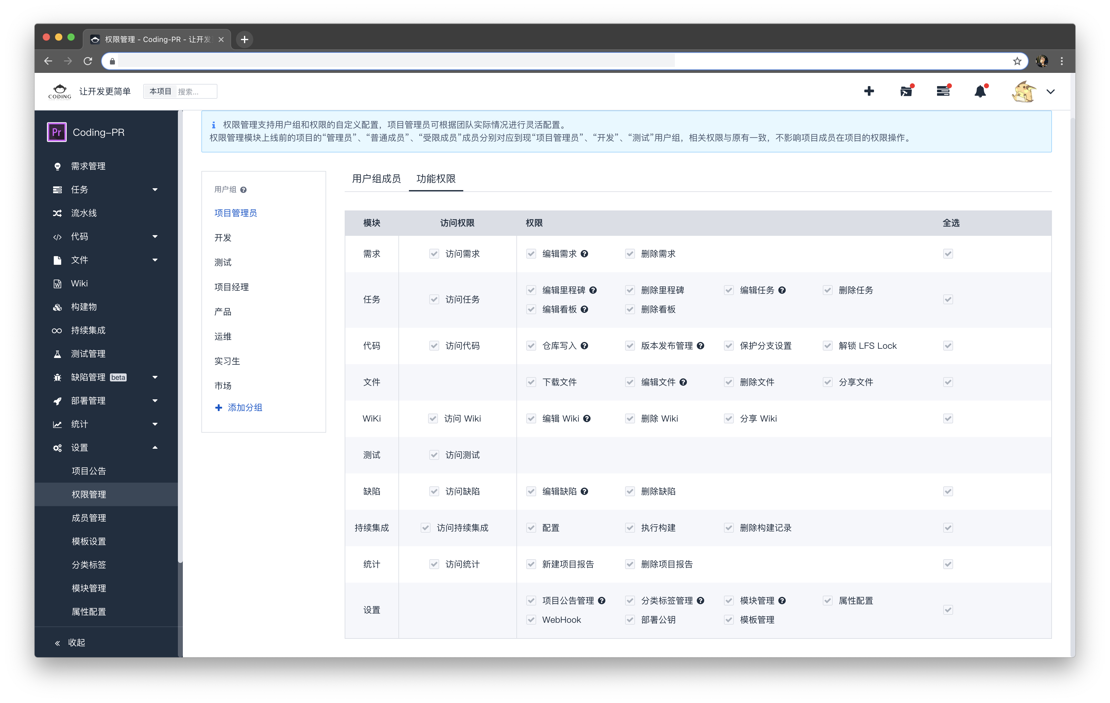 下周即将上线的 CODING 权限管理功能,可以帮助项目管理员方便地根据项目成员角色来分配相应的权限,减少误操作带来的安全隐患。同时支持自定义用户组,增加研发管理的灵活性。