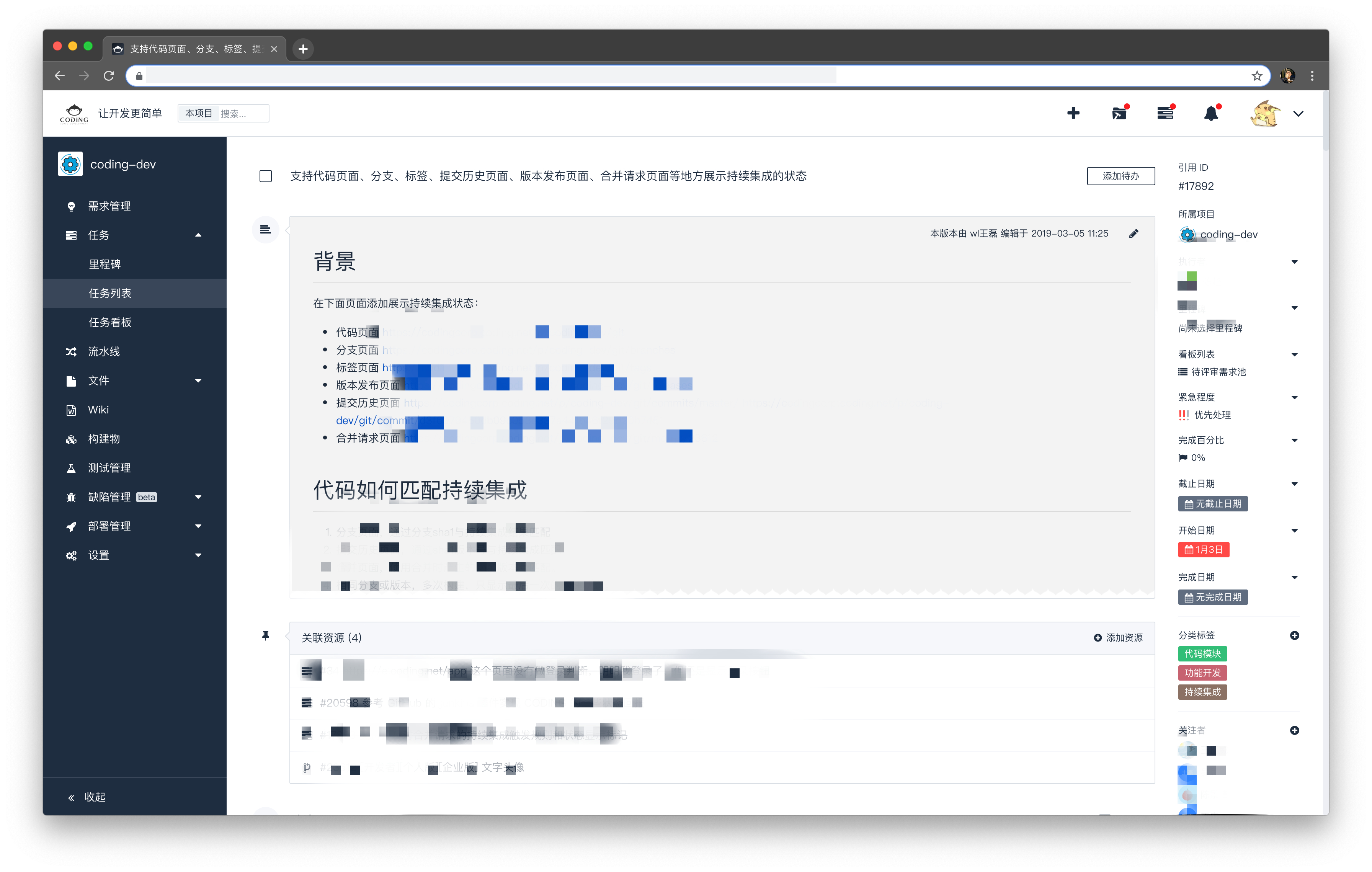 CODING 强大的任务系统支持标签、跨项目引用、版本控制等多项功能,并会实时记录用户的每一次操作。同时 CODING 需求管理功能也即将上线,将在任务系统之外为用户提供更细分更场景化的使用方式。