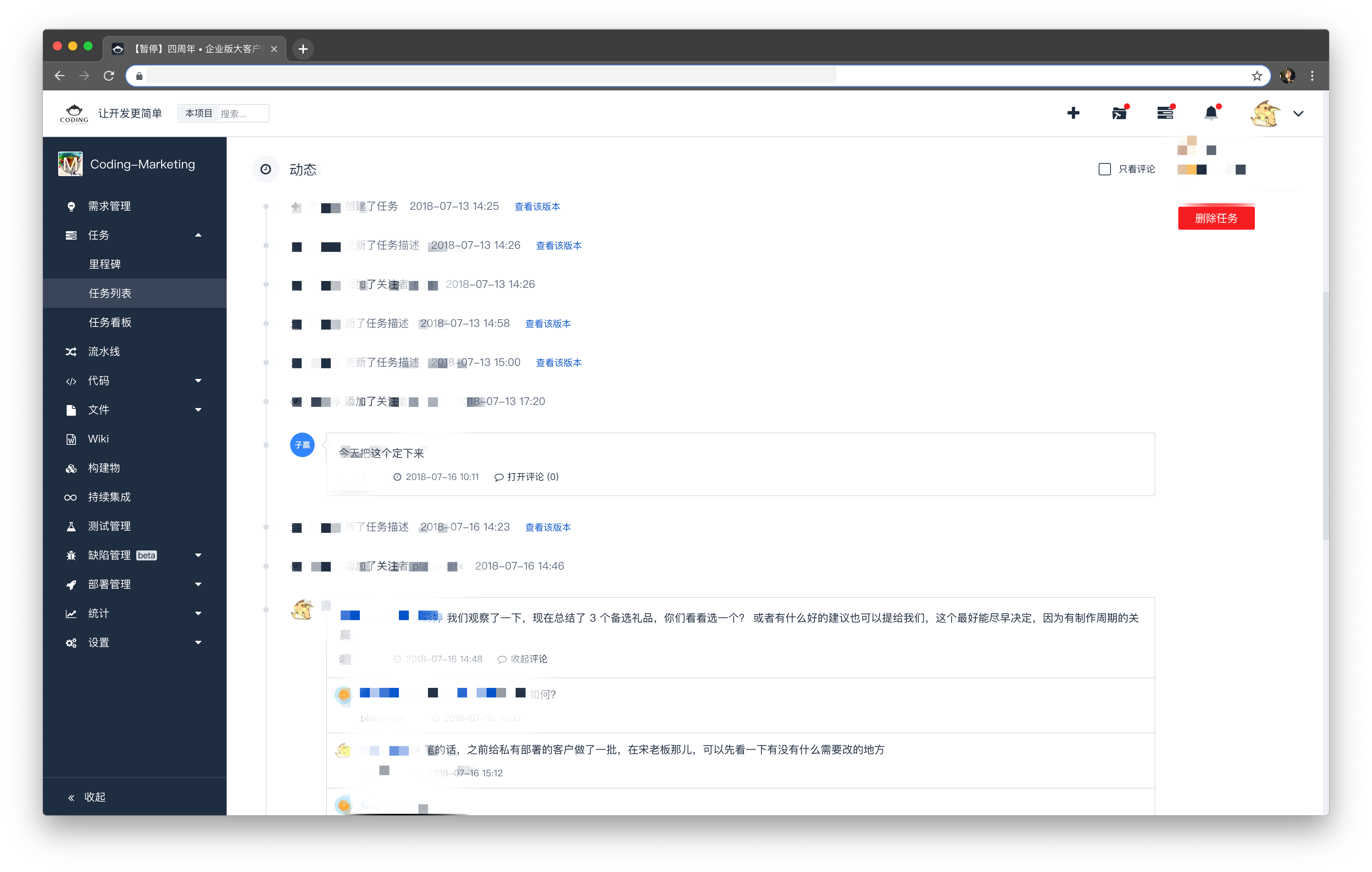 市场部的同事使用 CODING 任务管理中的讨论功能,可以实时讨论和跟踪项目进度。