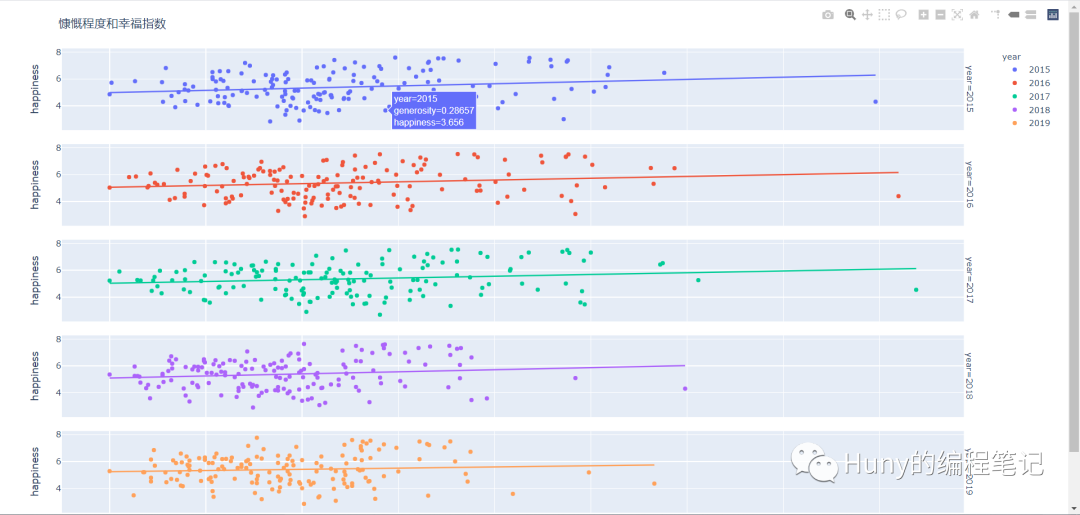 # 散点图fig = px.scatter(df_all, x='healthy_life_expectancy',y='happiness',facet_row='year',color='year',trendline='ols')fig.update_layout(height=800, title_text='健康预期寿命和幸福指数')plot(fig, filename=f'{file_path}/健康预期寿命和幸福得分.html')