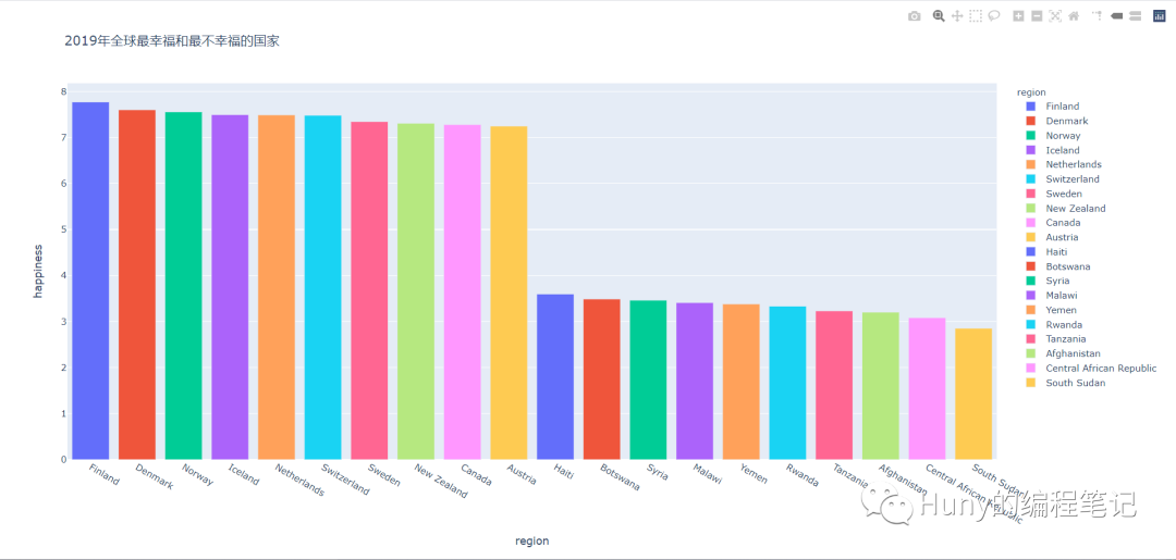 # 合并数据rank_top10 = df_2019.head(10)[['rank', 'region', 'happiness']]last_top10 = df_2019.tail(10)[['rank', 'region', 'happiness']]rank_concat = pd.concat([rank_top10, last_top10])# 条形图fig = px.bar(rank_concat,x="region",y="happiness",color="region",title="2019年全球最幸福和最不幸福的国家")plot(fig, filename=f'{file_path}/2019世界幸福国家排行Top10和Last10.html')