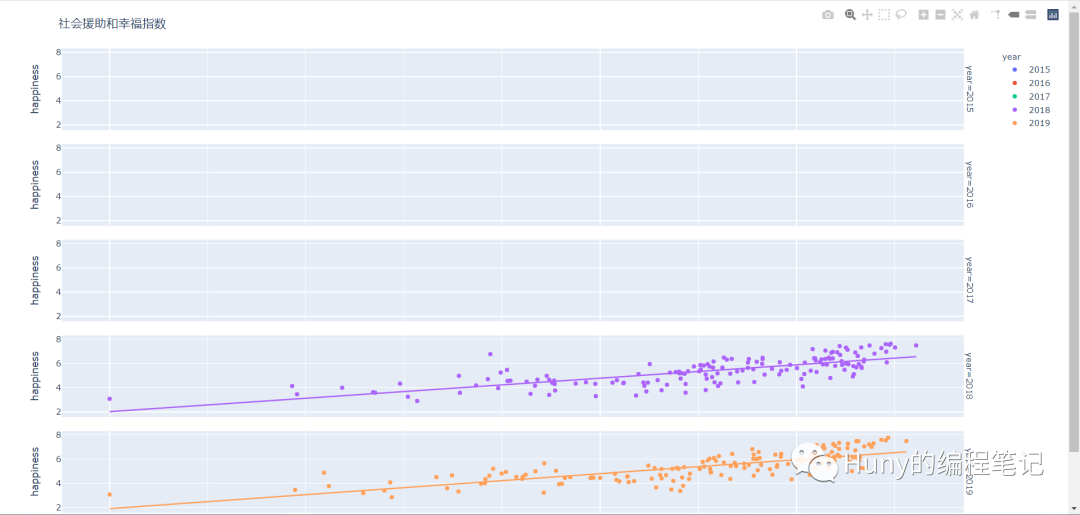#散点图fig = px.scatter(df_all, x='social_support',y='happiness',facet_row='year',color='year',trendline='ols')fig.update_layout(height=800, title_text='社会援助和幸福指数')plot(fig, filename=f'{file_path}/社会援助和幸福得分.html')