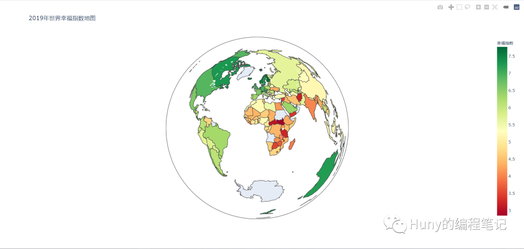 import numpy as npimport pandas as pdimport os,sysimport matplotlib.pyplot as pltimport seaborn as snsimport plotly as pyimport plotly.graph_objs as goimport plotly.express as pxfrom plotly.offline import init_notebook_mode, iplot, plot#数列的路径file_path = os.path.dirname(os.path.abspath(__file__))# 读入数据df_2015 = pd.read_csv(f'{file_path}/2015.csv')df_2016 = pd.read_csv(f'{file_path}/2016.csv')df_2017 = pd.read_csv(f'{file_path}/2017.csv')df_2018 = pd.read_csv(f'{file_path}/2018.csv')df_2019 = pd.read_csv(f'{file_path}/2019.csv')# 新增列-年份df_2015["year"] = str(2015)df_2016["year"] = str(2016)df_2017["year"] = str(2017)df_2018["year"] = str(2018)df_2019["year"] = str(2019)# 合并数据df_all = df_2015.append([df_2016, df_2017, df_2018, df_2019], sort=False)df_all.drop('Unnamed: 0', axis=1, inplace=True)df_all.head()data = dict(type='choropleth',locations=df_2019['region'],locationmode='country names',colorscale='RdYlGn',z=df_2019['happiness'],text=df_2019['region'],colorbar={'title': '幸福指数'})layout = dict(title='2019年世界幸福指数地图',geo=dict(showframe=True, projection={'type': 'azimuthal equal area'}))choromap3 = go.Figure(data=[data], layout=layout)plot(choromap3, filename=f'{file_path}/世界幸福地图.html')