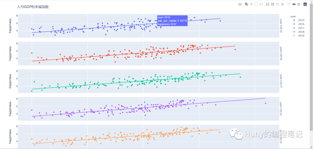 # 散点图fig = px.scatter(df_all, x='gdp_per_capita',y='happiness',facet_row='year',color='year',trendline='ols')fig.update_layout(height=800, title_text='人均GDP和幸福指数')plot(fig, filename=f'{file_path}/GDP和幸福得分.html')