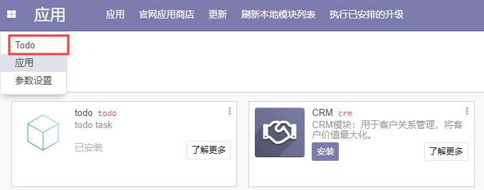 这样我们就可以在右上角的搜索框中搜索todo了,如果是模块的话,记得叉掉应用后再查找模块名,这里因为我们已经配置了todo为应用,所以可以直接查找,查找结果如下:
