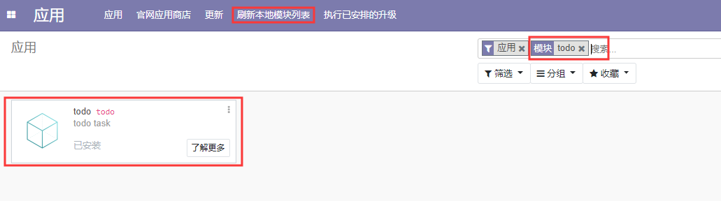 点击安装,然后会刷新,但是刷新后你会发现还是回到了应用页面,并且再次搜索todo后,会显示已安装。