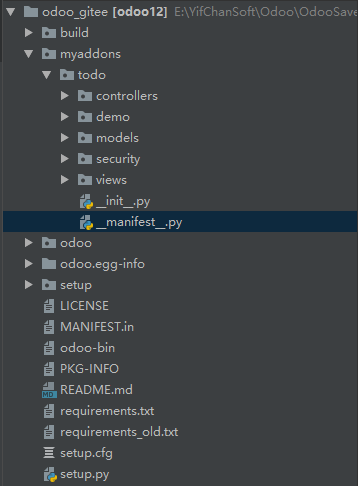 以上命令代表,在myaddons目录下创建一个名为todo的模块。