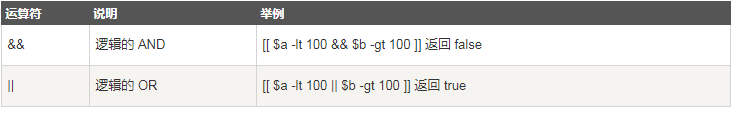 echo "$a 小于 100 且 $b 大于 15 : 返回 true"