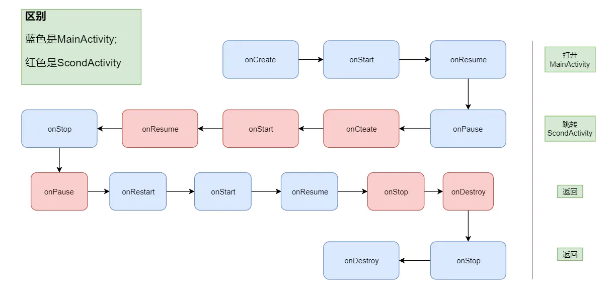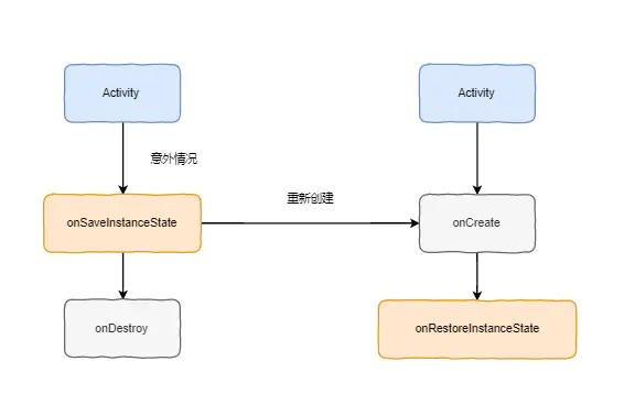 - 当Activity被重建后,系统会调用onRestoreInstanceState,并且把onSave(简称)方法所保存的Bundle对象同时传参给onRestore(简称)和onCreate(),因此可以通过这两个方法判断Activity是否被重建,调用在onStart之后;