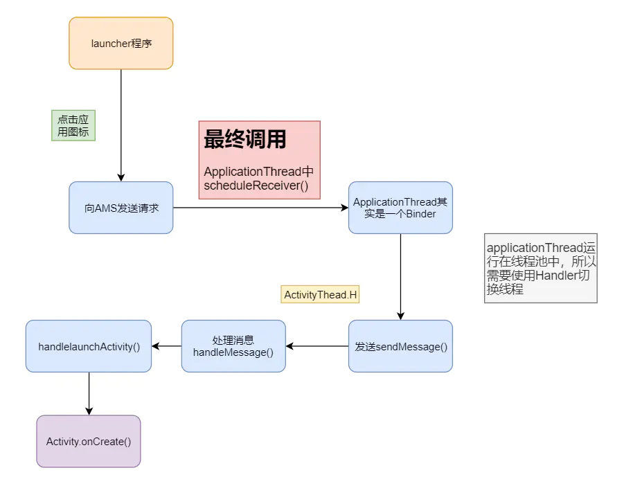 1、点击桌面App图标,Launcher进程采用Binder IPC向system_server进程发起startActivity请求; 2、system_server进程接收到请求后,向zygote进程发送创建进程的请求; 3、Zygote进程fork出新的子进程,即App进程; 4、App进程,通过Binder IPC向sytem_server进程发起attachApplication请求; 5、system_server进程在收到请求后,进行一系列准备工作后,再通过binder IPC向App进程发送scheduleLaunchActivity请求; 6、App进程的binder线程(ApplicationThread)在收到请求后,通过handler向主线程发送LAUNCH_ACTIVITY消息; 7、主线程在收到Message后,通过发射机制创建目标Activity,并回调Activity.onCreate()等方法。