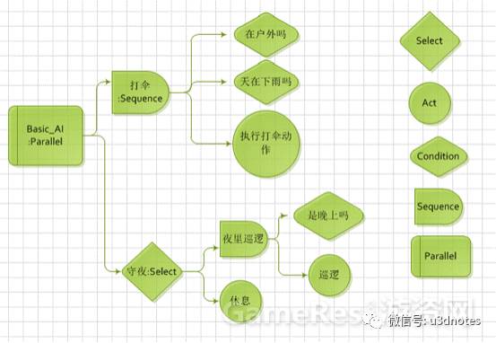 接下来我们看一个行为树构造的AI,这个AI的逻辑文字表述为,一个NPC在晚上需要执行巡逻任务。而且如果天下雨的话,户外的人是需要打伞的。