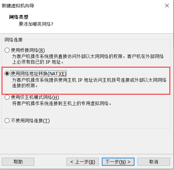 要选择NAT转换方式,一共有三种网络方式,分别是桥接网络,NAT网络和主机模式网络