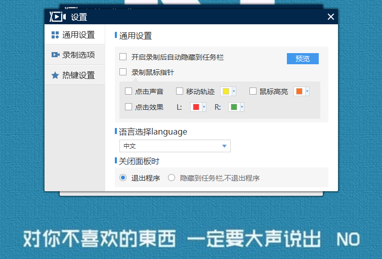 4、如果在录制的过程中,需要使用鼠标的操作,可以点击设置,选择通用设置,勾选上录制鼠标指针,选择声音和移动轨迹等。