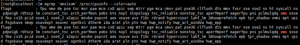 egrep 'vmx|svm' /proc/cpuinfo --color=auto